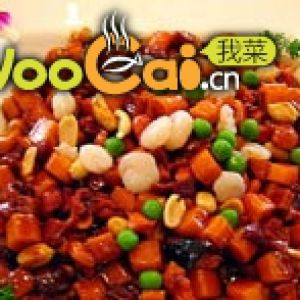 然后放甜面酱(没有甜面酱的可以用酱油和糖代替,不过味道差一点),继续炒,炒到酱色都均匀裹在各种丁上了.