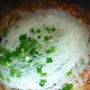 小火下豆瓣酱烧出红油,顺序下肉碎炒下红萝卜蒜姜炒后加入雪菜炒均匀,放入一小碗水,下粉丝盖上煮3~5分左右