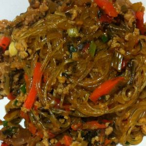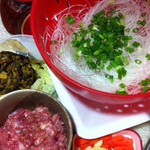 材料准备好,肉碎用酒,生粉,酱油调好备用,龙口粉丝用凉水泡软,捞起放干