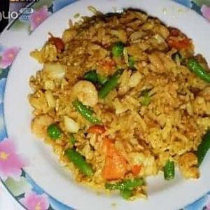 下虾仁、鱿鱼片、青豌豆、胡萝卜丁、咖喱粉和盐