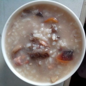 蘑菇放入烧热的水里烫一下,捞出来后把蘑菇的水挤干放入正在熬粥的锅内
