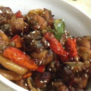 另起一锅放油,将姜蒜爆出香味,跟着放青辣椒和指天椒炒一下,最后放干辣椒煸香。(注意:干辣椒最容易烧黑,所以最后放入)
