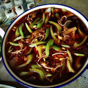等高压锅煮好后,将食材倒进放豆芽的盆子里,再摆上烫熟的西芹即可。