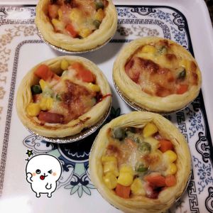 ①玉米碗豆胡萝卜粒超市买冰冻现成的,拿去焯水一下。②准备现成的蛋挞皮在皮上先涂抹番茄酱加入焯好的玉米粒,香肠切丁加入最后加入奶酪碎