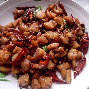 锅内剩的油加少许盐,放入干辣椒煸出香味,倒入鸡丁翻炒,出锅前加入葱段,少许鸡精即可