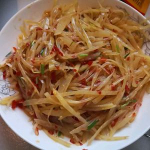 锅中放油,油烧好后小火,倒入准备好的辣椒,炒香,然后加入土豆丝翻炒,加入适量的盐,鸡精,十三香。