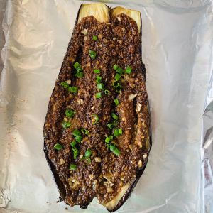 把茄子从中间剖开,小心烫哦~把料汁均匀的涂在茄子上,划几刀更入味哦。入烤箱再烤5-10分钟,取出撒葱花即可。