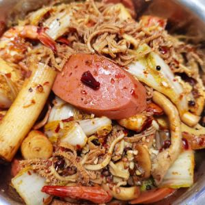起锅烧油,低温放火锅底料,料炒散后倒入烫好的肉菜,放盐,花椒粉翻炒五分钟。倒入两勺清水盖锅盖闷两分钟左右。最后放入蒜蓉,加两勺醋翻炒几下即可。齐活儿!