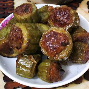 起锅烧油,放入蒸熟的苦瓜酿,煎至有点黄反面。