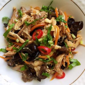 鸡腿撕丝和木耳胡萝卜丝放到大碗,加上调味料,带上一次性手套抓,抓到调味料和鸡丝完全融合,装盘开吃。喜欢香菜的可以加些香菜一起拌,我不怎么喜欢香菜味道,装盘后撒了些芹菜粒。