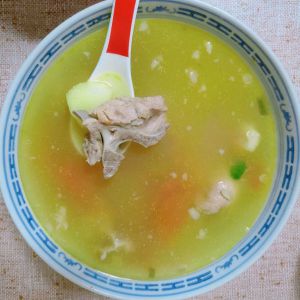 将苹果块全部取出,(苹果只是用作调味)最后装入大汤碗,完成咯,一家人喝的暖乎乎滴~