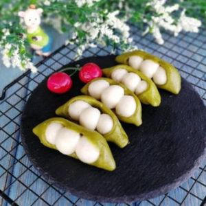 取出绿色面团,擀成大面片,用圆口被子或磨具,做成饺子皮,白色面团揉成小白球