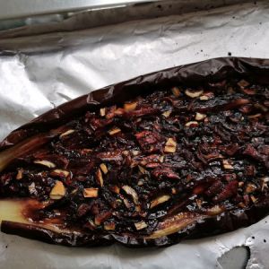 将茄子从烤箱中拿出来,用刀划开表面的皮,将内部筋条撕开,越开越好,利于味料分散在表面