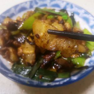 姜片,蒜片加入五花肉一起煎,煎到两面有点焦黄,把菜捞出。油留在锅里,加入花椒粒(喜欢辣的,加入干辣椒),炸出香味后,捞出花椒粒。
