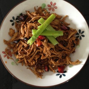 大火 加入各种大料爆香 转小火 加入鸡丝 一起鳊炒