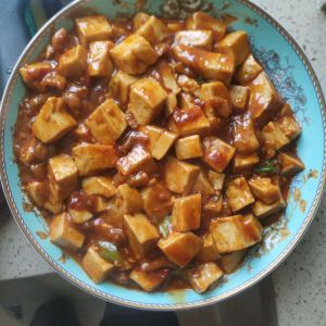 豆腐煮两分钟后,用生粉水勾芡,烧开,最后汁都沾在豆腐上,成粘糊装就可以出锅了!