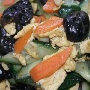 锅烧油,葱蒜炝锅,下去黄瓜木耳胡萝卜翻炒,加盐味精鸡精调味,翻炒下入鸡蛋,来点老抽调色翻炒均匀出锅装盘即可