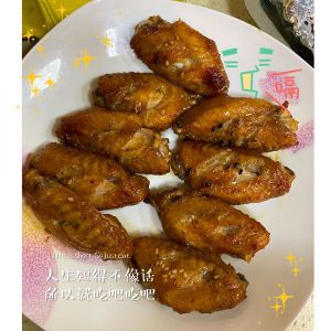 腌制好的鸡翅摆放在烤盘中,再刷一遍剩余的调料。放入烤箱200度25分钟