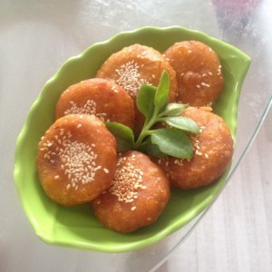 将蒸熟的南瓜捣成泥,加入适量的糯米粉,白糖,芝麻