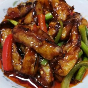 放入炸好的茄子快速翻炒。茄子都裹上汤汁