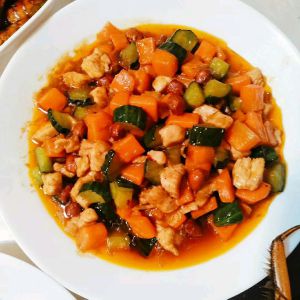 刷锅 继续倒油 葱蒜炒香倒入豆瓣酱超出红油 然后倒入炒过的鸡丁 胡萝卜黄瓜翻炒放盐糖鸡精 然后加水 差不多熟了之后倒入淀粉水收汁 最后放入果仁