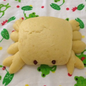 3、面团再次揉匀排气分成8到10个剂子取一剂子擀成牛舌状,再取一剂子分成四份揉成同样的长条,把长条摆放在牛舌状的面片上,面片对折翻过摆出造型剪出蟹钳和蟹脚两粒红豆摁在前端做眼睛,螃蟹就做成了。