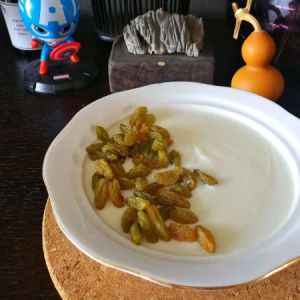 最后撒点爱吃的水果。双皮奶和红豆是绝配,可惜我是临时起意,家里没有红豆也没有水果,只能将就的撒点葡萄干了