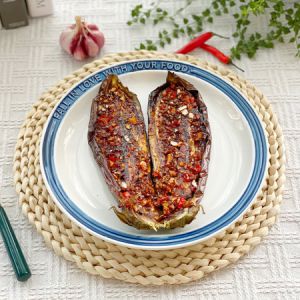 16分钟后,茄子基本烤熟了,如果不好把握,可以用叉子,插下能轻松穿透就可以了,用刀把茄子从中间切开。