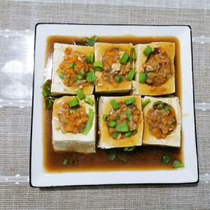 装盘:豆腐块装盘。锅里的汤汁加入淀粉水,粘稠后倒在豆腐块上。撒上葱花,完事。