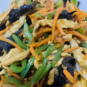所有材料切丝,瘦肉丝用鸡蛋清腌一下,会很嫩,热锅凉油,油热放瘦肉丝,翻炒至变色。