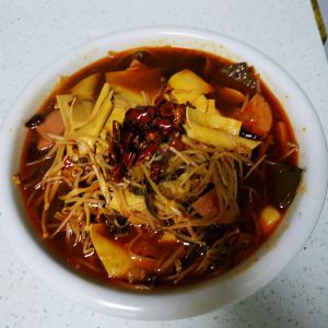 锅内汤汁开了,放入火腿片百叶小火咕噜。待煮好点入香油花椒油,将炸好的辣油浇在汤中。