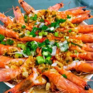 起锅热水,放入锅中隔水蒸个八分钟。蒸好后,洒些葱花在上面,起锅热油,用热油淋在葱花上即可,一道美味口可的蒜蓉粉丝蒸虾就做好了。