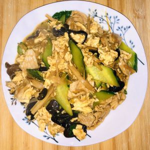 将里脊肉切片用淀粉、料酒、盐抓匀备用,黄花、木耳焯水备用,鸡蛋加少许水淀粉、盐打匀备用,黄瓜切片备用