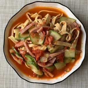 豆腐皮切窄条,火腿切条,西红柿切块,黄瓜切片