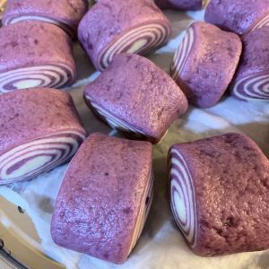 揉好的面团,擀成长方形的薄片。白色放上面,紫薯面放下面,然后卷起来,卷好后再搓一下,去边,切成大小差不多的小块。