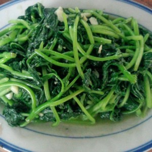 炒锅中加入油和大蒜爆香,加入虾酱翻炒下放入地瓜叶爆炒