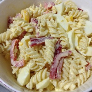 鸡蛋白煮,蛋黄跟蛋白分离。蛋黄跟色拉酱,牛奶搅拌;蛋白和灯笼辣椒切成长条;意粉煮个12分钟撩起。