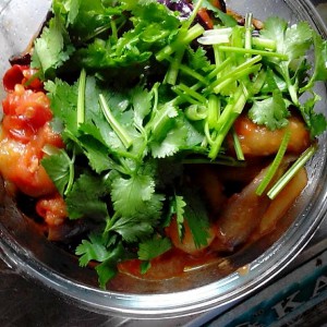 一勺油,烧热,把蒜,辣椒,鸡精,酱油,盐,放进去,烧出香味,就可以下西红柿了,把西红柿炒成汁的时候就可以把茄子倒进锅里,翻几下,就可以起锅了,最后撒上香菜,最OK啦