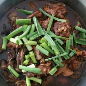 翻炒完加入一小碗水,炖至水快干出锅,出锅后放入蒜苗