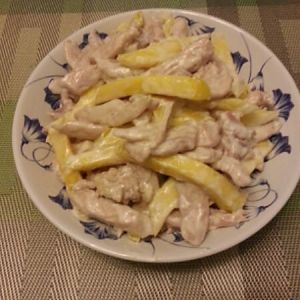 鸡腿淹十分钟,炒熟,乘出放凉。鸡柳,芒果放入盘中,加两荼匙拌匀,开吃!