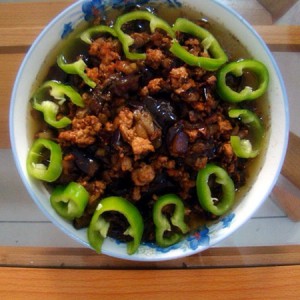 炒熟肉末后把开始捞出的茄子倒入锅中翻炒均匀,加少许香油、盐调味即可出锅