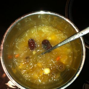 待汤开始有一点粘稠的时候说明银耳的胶质慢慢在出来了(这个过程大概需要1小时左右),这时候就可以把洗净的枸杞、红枣、桂圆放入汤中继续煮,半小时左右就可以出锅了!