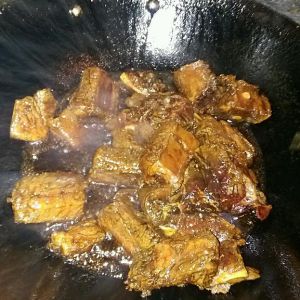 倒入油,把姜爆香,倒入排骨翻炒,依次倒入番茄酱,倒入料酒以后盖锅一分钟,去腥!然后放入糖,