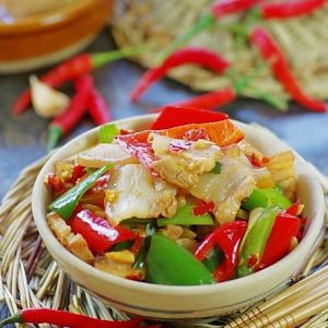 五花肉洗净、切片,青红椒切块,青葱切段,蒜切片,姜切末;