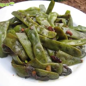 炒锅中加入食用油,放入蒜末炒出香味,再放入焯好的豆角,添少许热水盖锅盖焖一会儿。