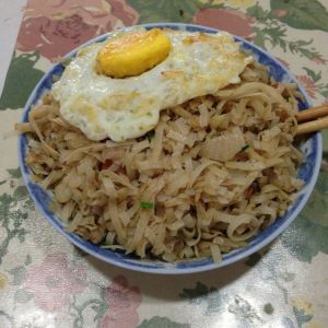 起锅,!把之前煎好的蛋放上去就行了,!主要不想吃下的面,!所以就想法炒了,!