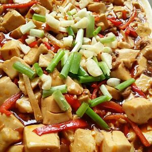 然后放入适量的酱油,再加入辣椒。用盐调味。然后下入豆腐煮开。豆腐煮大约3-5分钟。用水淀粉勾芡。此时要边摇锅边用手勺推动锅底,使豆腐不至糊锅,当淀粉彻底糊化后便可出锅码盘。