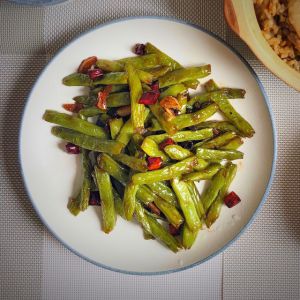 炒锅烧热,多倒一些油(以可以完全漫过四季豆为准),烧至七八成热,放入四季豆,大火炸至表面皱皮后捞出