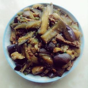 锅中热油,加入姜蒜青椒末爆香,加入肉末,炒熟以后加水和黄豆酱,加入茄条煮至成熟,最后加入酱油,盐调味。加入葱末,出锅。