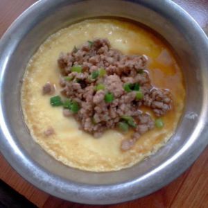 这时蒸的也差不多了,把锅里肉末直接倒入蛋羹上,再撒上葱花,豆腐蒸蛋好啦。